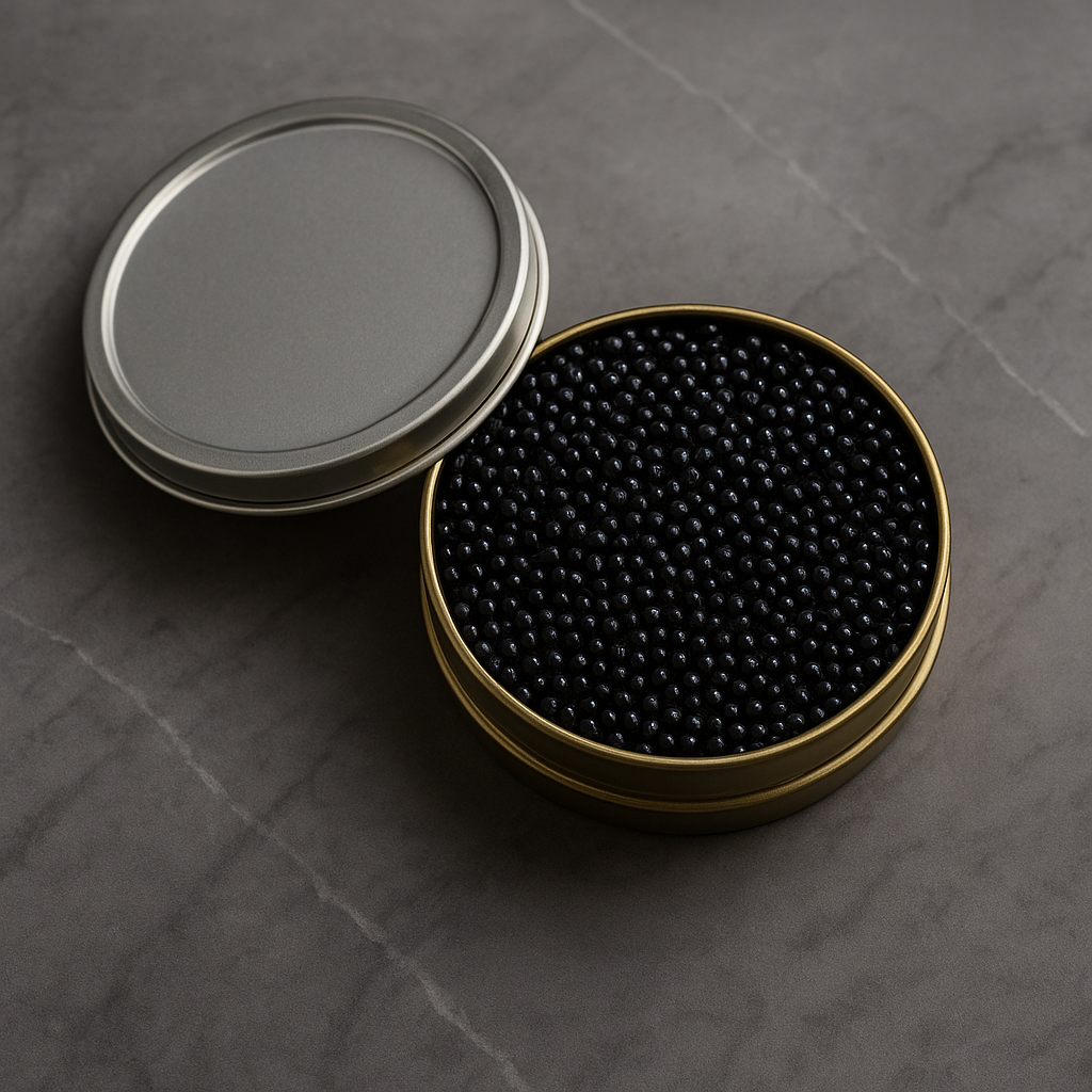 Authentic Persian Asetra Caviar – 250g, sourced from the Acipenser gueldenstaedtii sturgeon. Medium-firm pearls with warm golden-amber tones, a refined nutty flavour, and exceptional Persian craftsmanship in every grain.